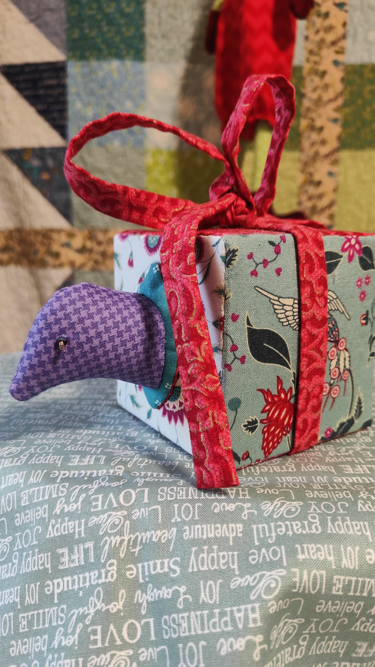 Bird in a Box is the perfect Christmas ornament project for a quiet weekend. He isn’t your typical cookie cutter Christmas project, but he will certainly impress your family members and friends. You can sew him up with an assortment of Christmas fabric scraps, or you can make him from a fat eighth bundle of festive quilting cottons.