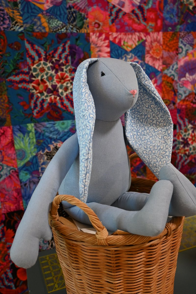 Blue the Bunny Doll is a sewing pattern for a blue version of Rosie the Bunny that comes with a pattern for cute dungarees instead of a dress.