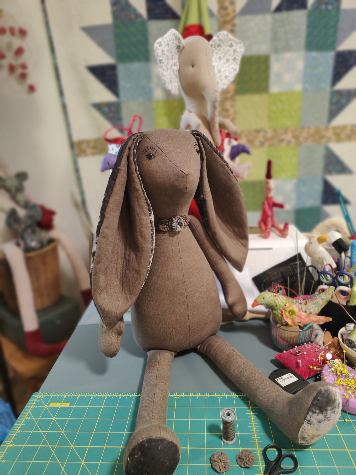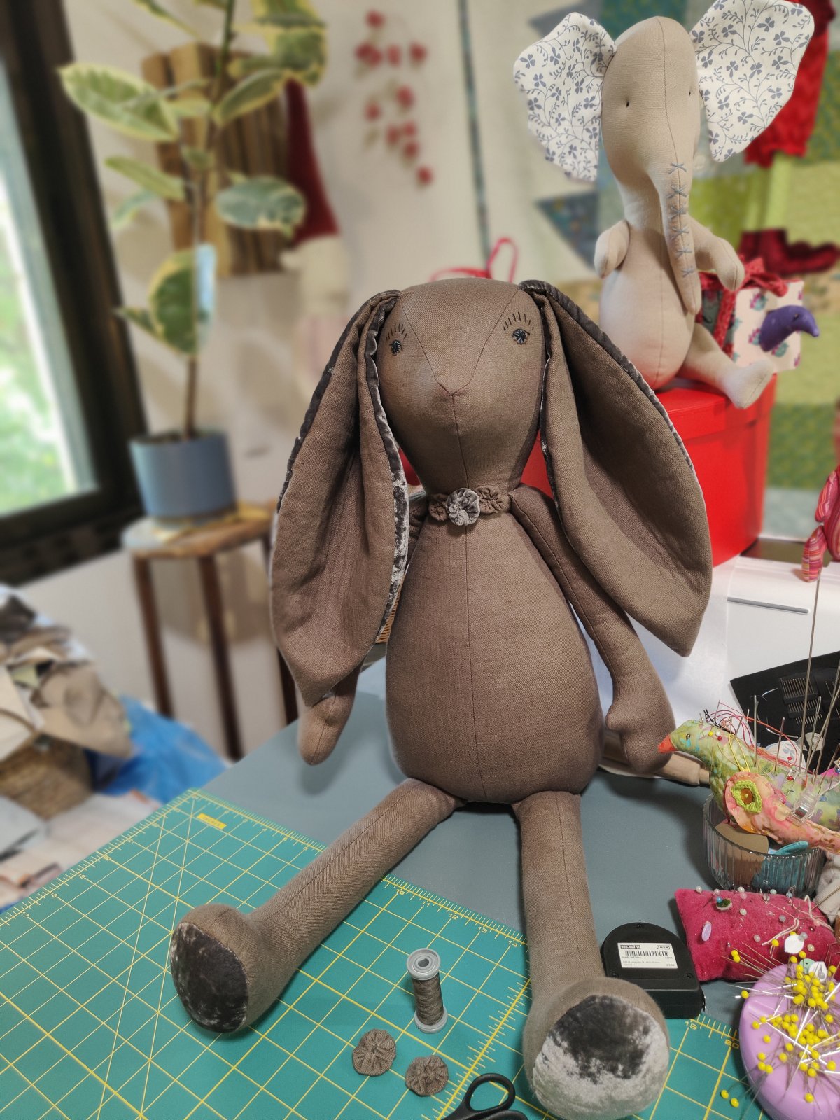 Cocoa the Bunny is a very big doll, approximately 30 inches / 76 cm tall when she is standing. She is quite a bit larger than Rosie the Bunny, so she has very long ears! Her feet have foot soles, but she is quite easy to sew. Sewing Cocoa the Bunny does require a good day's work, but the results are so satisfying, she will make anyone smile, adults and children alike!